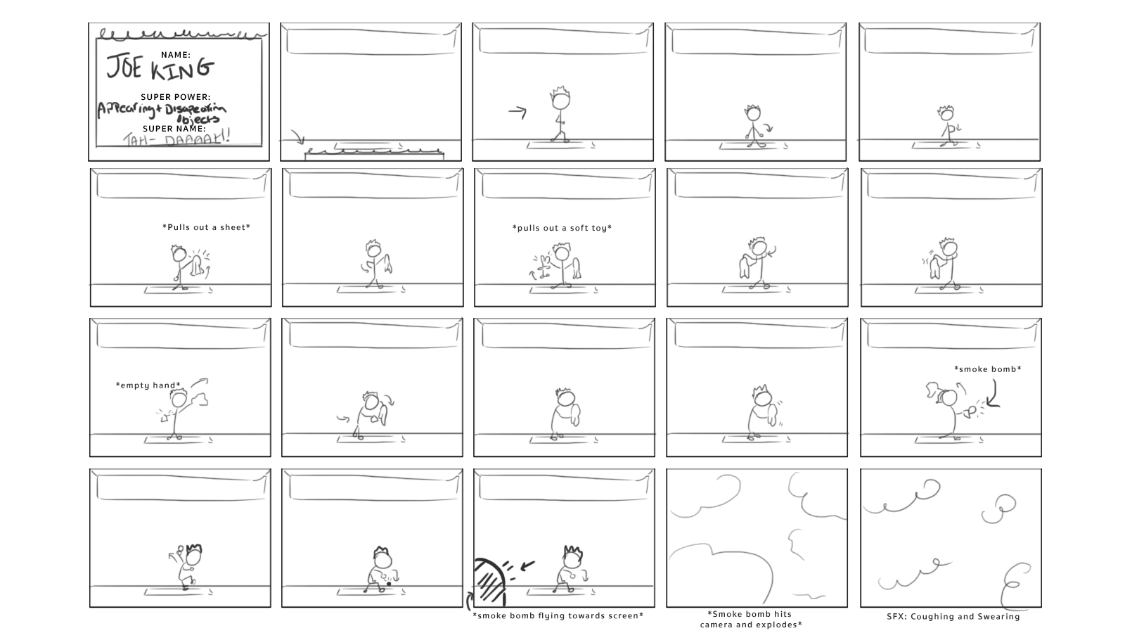 After looking over the characters we currently have, the team have decided that it would be best for us to cut and change some of the struggling characters, with two of mine being Joe King and Burnham G. I decided after struggling to come up with a skit for the King twins that I would scrap them both, however use Joe's name to replace Burnham's, as I felt that his old name was too violent and wants making sense with the updates I had to make to him, as well as I had to change his skit so it represented the brief more, which is an issue we are struggling with as we finalise these characters and move forward in the project. So far I am happy with the update on Joe (formally Burnham) and feel that his skit fits more with the brief and ties the story together as well as his final Moom design.